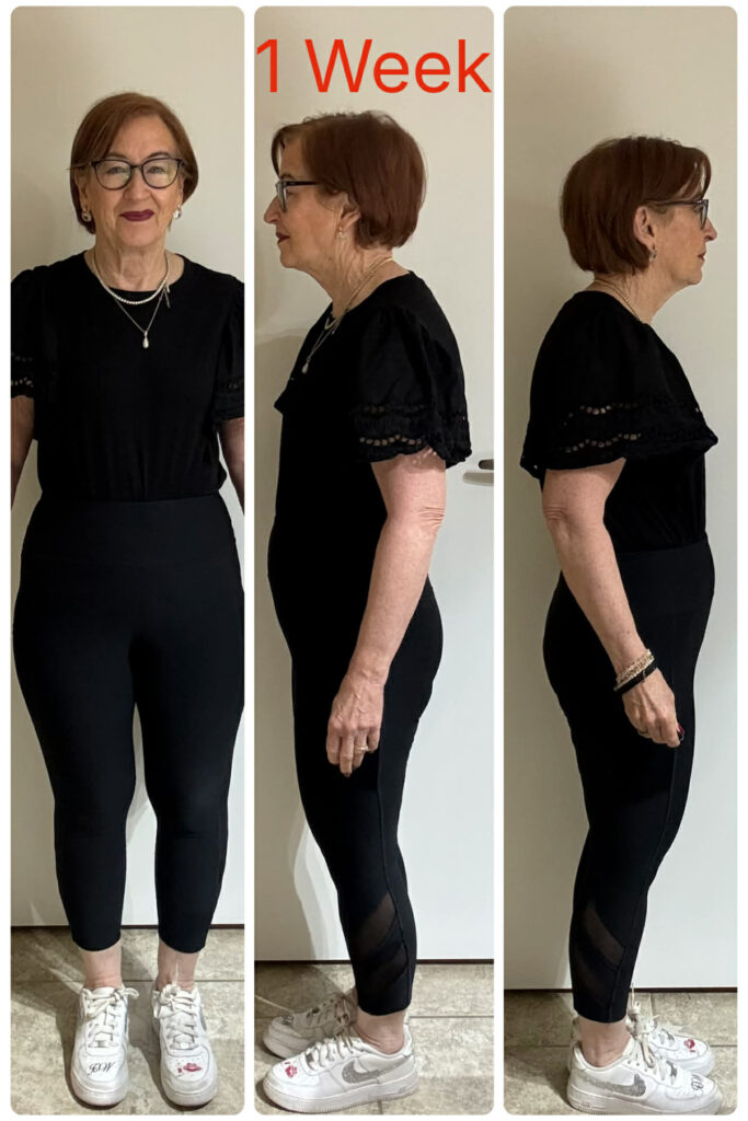 I am sharing my before-and-after pictures from my first round here, (Day 1), as well as (Week 1), just as a reminder of what’s possible.